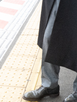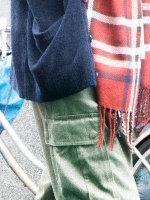 薄めのトーンの春らしいスタイリング。スリッポンの広めの履き口から覗くソックスの赤がしっかり効いてます。 -
